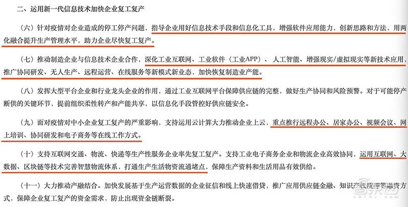 ▲《工业和信息化部办公厅关于运用新一代信息技术支撑服务疫情防控和复工复产工作的通知》部分内容
