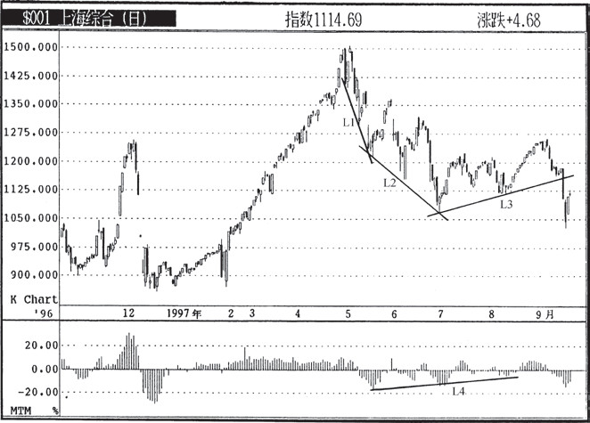 这是上海股市综合指数的日蜡烛线图,时间从1996年年底到1997年9月底。其中下半图为动力指数刷形图,L1、L2和L3是上图的三根支撑线,它们的斜率代表了市场下降的速度。在下降趋势中,市场最主要的特征就是不断地创造价格新低,因此,连接其低点而成的这类趋势线具有表征下降趋势力度的重要意义;反过来,上升趋势最主要的特征就是不断地创造价格新高,因此,连接其高点而成的趋势线也有表征上升趋势力度的重要意义。同摆动指数相比,这类趋势线更能准确、及时地反映市场运动速度的变化。从信息量上说,它们几乎覆盖了摆动指数,在“血缘”上,摆动指数几乎是它们的直接后代。如图所示,从L1、L2到L3,斜率由下倾变上倾,在动力指数图上,反映在L4的上倾上。