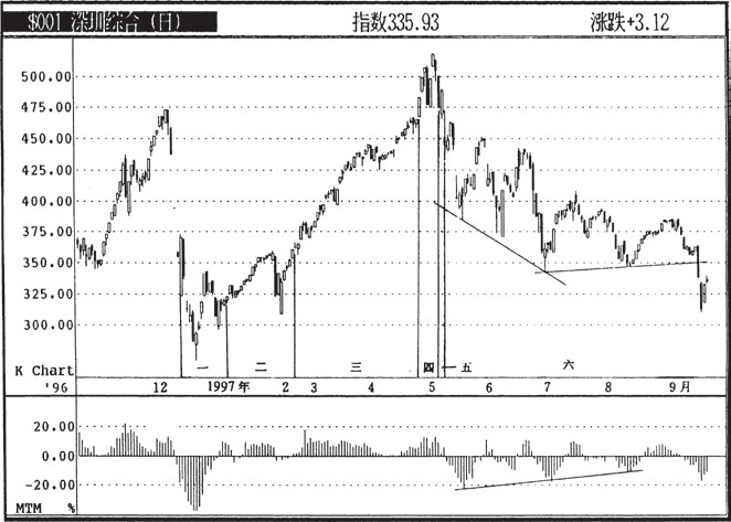 译序图2,为深圳股票综合指数日蜡烛线图。其中我们把主要趋势规模的一个完整市场周期,粗略地划分为六个阶段。在译序图1上,我们也标出了这六个阶段,两者是一个很好的对照。下面,我们对这六个阶段做一点示意性的简要解说。必须指出,这样的描述仅仅是一种概念性说明,与实际的市场演变过程当然不会完全相同。