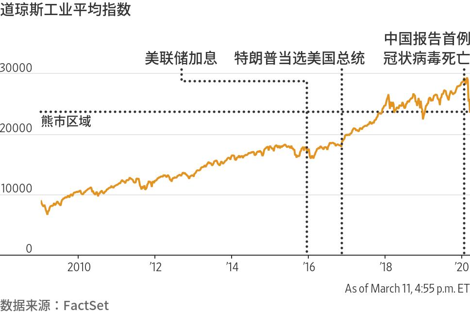 3月11日晚,世卫组织认定新冠病毒为全球“大流行病”,美股跌势加剧。截至收盘,美股三大股指中,道琼斯工业平均指数暴跌5.9%至23553.22点,较2月12日的历史高点下跌20.3%,结束了长达11年的牛市。标普500指数下跌4.9%,纳斯达克综合指数下跌4.7%,接近熊市边缘。