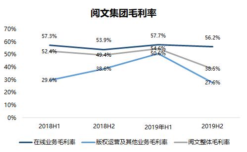 综合阅文公布的2019年中期报告,阅文毛利率在2019年下半年时出现大幅下滑,由上半年的54.6%降至下半年的38.5%,环比下降16.1个百分点。