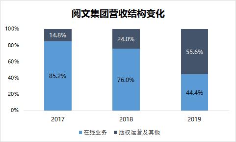 年报数据显示,阅文集团2019年全年的营收和利润均超市场预期,且公司营收结构发生改变,版权运营及其他业务取代在线业务(主要是付费阅读板块),成为其最大的营收来源,在总收入中的最新占比达到56%。阅文依靠IP变现来多元化营收的努力终于有了成果。