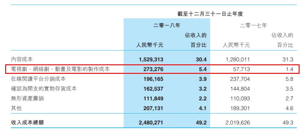 阅文在2018年度业绩中开始增加“电视剧、 网络剧、动画及电影的制作成本”