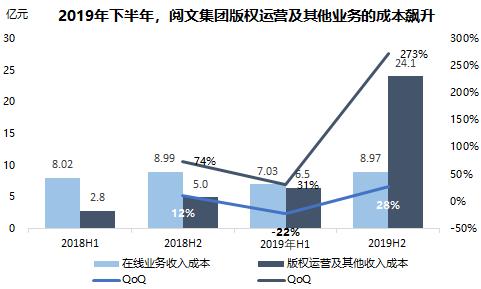 这与该业务板块飙升的收入成本有关。财报显示,2019年下半年,阅文版权运营及其他业务的收入成本达到24.1亿元,环比上半年大增273%。