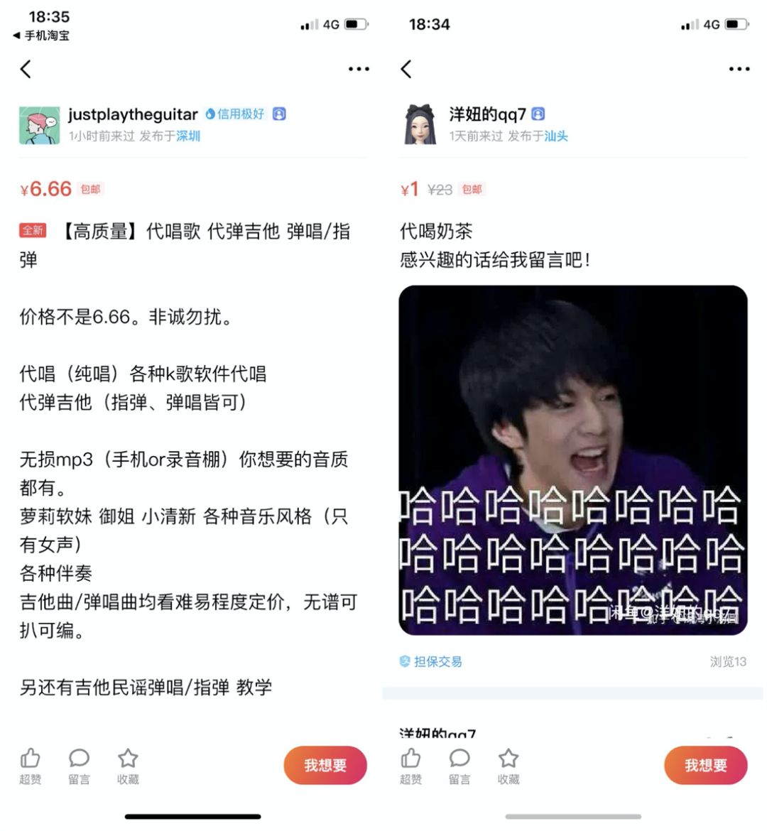 最典型的案例是闲鱼上出现的代唱歌、代练、代吃、代喝奶茶等业务。它的核心在于“猎奇”,往往是越奇葩越好,服务发布者总是提出满脑子稀奇古怪的想法。这种消费方式与其说是消费“代理”,不如说是在消费一种“体验”。