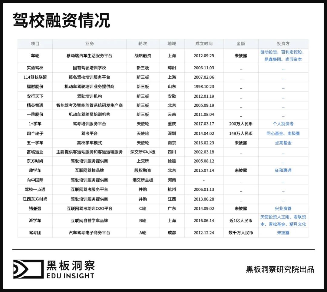 黑板洞察整合了近100家驾校相关企业,其中参与融资上市或并购企业共计19家