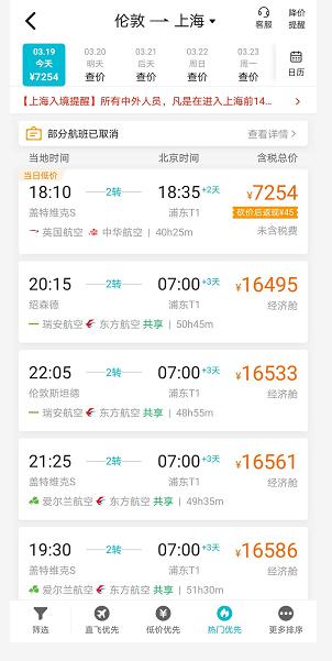回家,比想象中困难。这些天,从欧洲飞往中国大陆的机票水涨船高,去哪儿网显示,3月19日,从伦敦飞往上海的中转航班票价从7254元至58135元不等,多数航班为1万多元和2万多元,并且所有航班均需要至少转机2次。值得一提的是,这一天有5趟航班被取消。