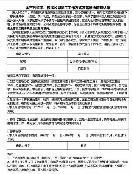 在一份名为《金吉列留学、移民公司员工工作方式及薪酬协商确认单》里,金吉列承认疫情导致公司的经营出现严重困难,目前“新增业务断崖式下跌,公司业务接近停滞。”