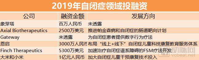 据动脉橙数据库不完全统计,2019年全球自闭症领域共发生6起融资事件,其中国内3起,海外3起。有趣的是,国内投融资事件均涉及康复、干预等领域,国外事件则集中在医药研发方面,披露金额均超过千万美元。