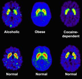 PET扫描肥胖、酗酒和可卡因成瘾者的大脑。健康大脑中红色的部分是多巴胺,它可以被糖、酒精和可卡因所取代。