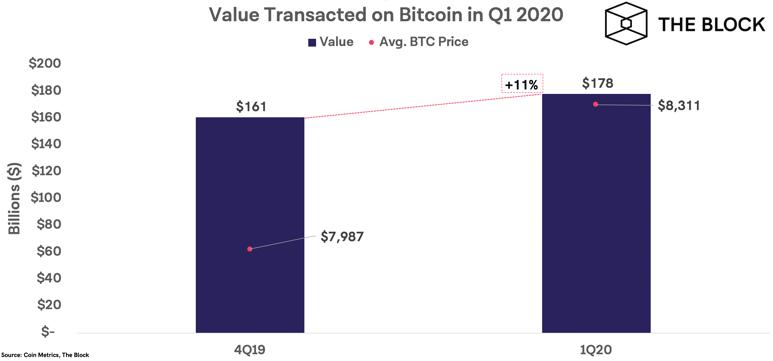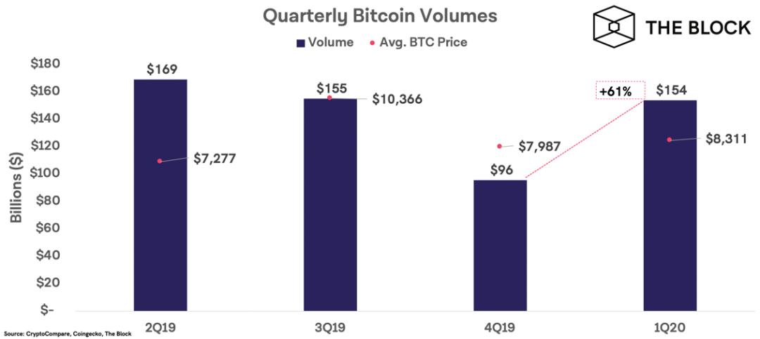 另据 The Block 统计,Q1 比特币交易量相比上一季度增长了 61%,从 960 亿美元增至 1540 多亿美元。
