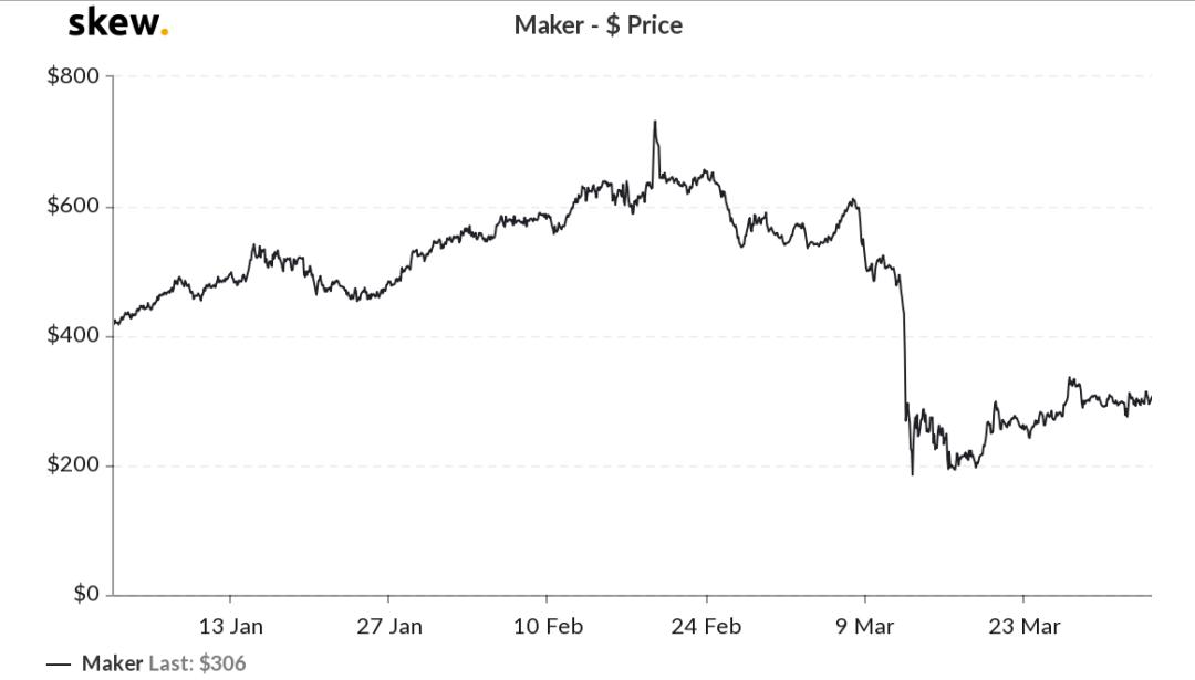 MakerDAO 原生管理型代币 MKR 价格也在 Q1 剧烈动荡:从年初的 433 美元一度上涨至 730 美元,最高涨幅 68.5%;但受到清算以及近期拍卖影响,MKR 价格直线下跌,一度跌至 170 美元,季度收于 293 美元,季度跌幅 32.3%。