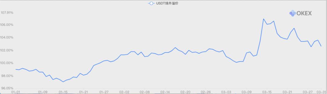 OKEx 交易大数据显示,USDT 场外溢价也从季度初的 99.1% 上涨至季度末的 102.59%,涨幅 3.4%;其中,3 月 14 日,USDT 场外溢价最高达到 106.92%,创下历史新高。