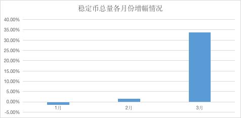 实际上,稳定币增发主要集中在 3 月,前两个月总量保持平稳,如下所示:
