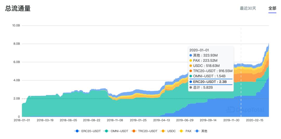 总体而言,Q1 季度稳定币总量在持续增长。Dapptotal.com 数据显示,总量从年初的 58.2 亿美元增长至 77.9 亿美元,涨幅达到 33.8%;相比于 2019 年 Q4 稳定币总量的增幅(11%),2020 年 Q1 增幅环比上涨 22%。