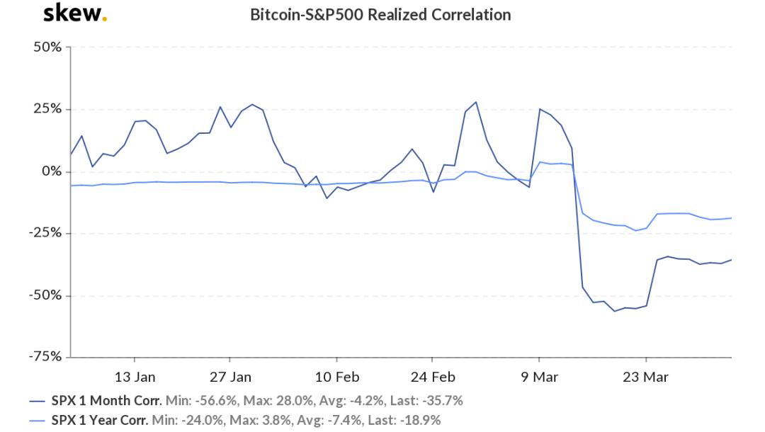 比特币与股票的关系,则更加复杂。3 月 12 日大跌之前,比特币与标普 500 相关性为正数,但小于 40%(低度线性正相关);3 月 13 至 3 月 23 日,两者为显著性负相关;3 月 23 日之后,两者为低度线性负相关。