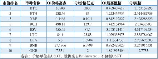 整个 Q1 ,BSV 最高涨幅最大,达到 373%;BTC 最高涨幅最小,只有 45.94%。