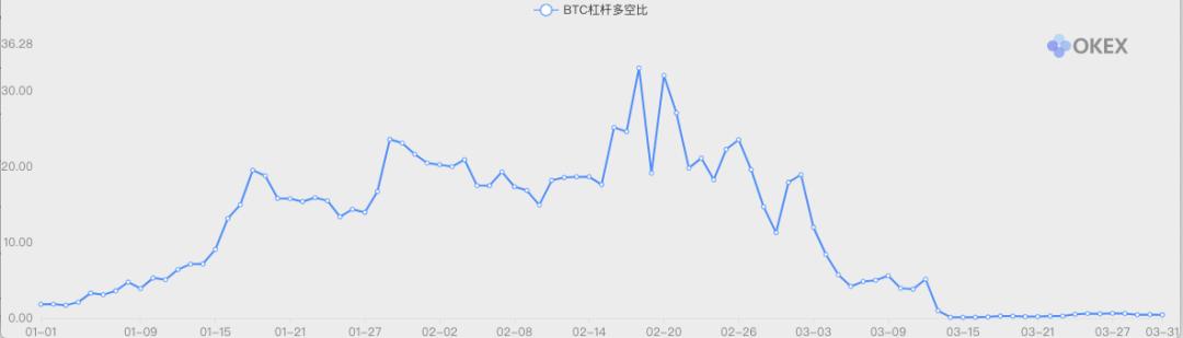 OKEx 交易大数据显示,BTC 多空杠杆比从季度初的 1.82,一度上涨至 32.99,涨幅超过 1700%,做多情绪剧烈;但在 3 月 12 日暴跌之后,多空杠杆比低于 1,最终收于 0.43,季度跌幅 76%。