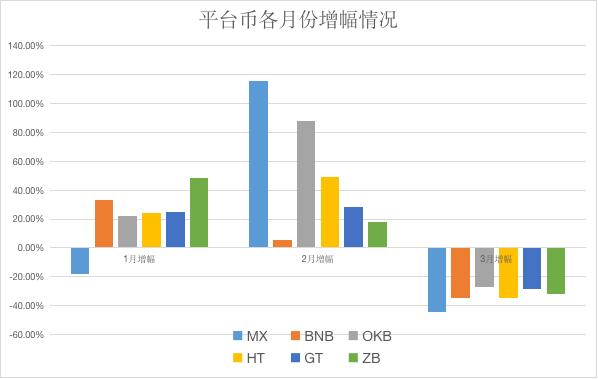 六家平台币在不同的月份表现各异,其中 ZB 和 BNB 在 1 月表现强劲,增幅分别是 48.1%、33.1%;MX 与 OKB 在 2 月表现亮眼,增幅分别是 115%、87%;但到了 3 月,MX 后势不足,跌幅领先,OKB 跌幅最小,只有 27%。