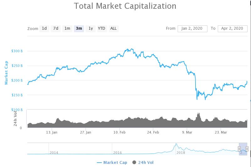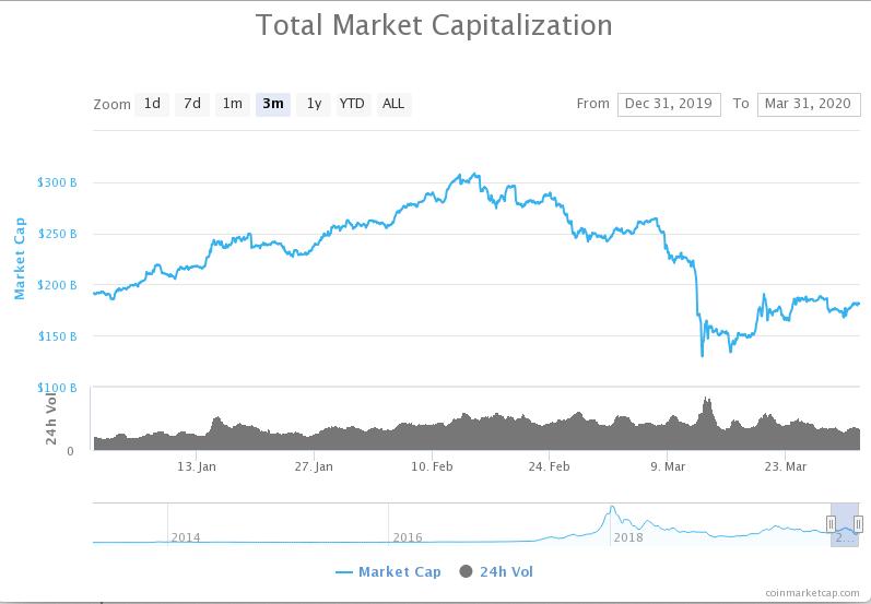据 CoinMarketCap,2020 Q1 加密货币总市值收报 1779.2 亿美元,季度增幅为 -7.07%,环比上涨 5%;总市值最高突破 3000 亿美元大关,达到 3087 亿美元(2 月 15 日)。