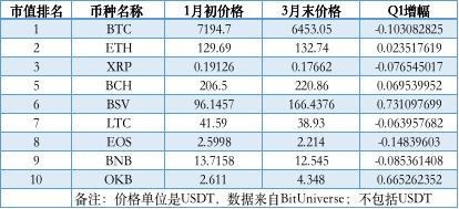 BitUniverse 数据显示,市值前十的币种中,2020 年 Q1 增幅只有四个币种呈正向增长,分别是:BSV(+73.11%)、OKB(+66.53%)、BCH(+6.95%)、ETH(+2.35%);跌幅前三的分别是:EOS(-14.84%)、BTC(-10.31%)、BNB(-8.54%)。
