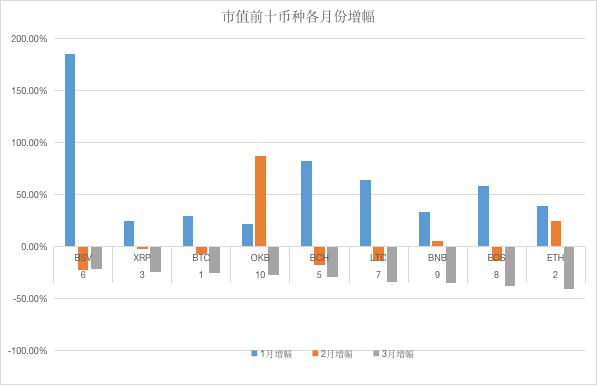 具体到单个月份,各币种表现不同。一月份 BSV 表现强劲,增幅最高达到 185%;二月份 OKEx 销毁未流通的平台币,推动 OKB 上扬,2 月涨幅达到 87%;3 月份的下跌行情中,ETH超跌,达到40%。