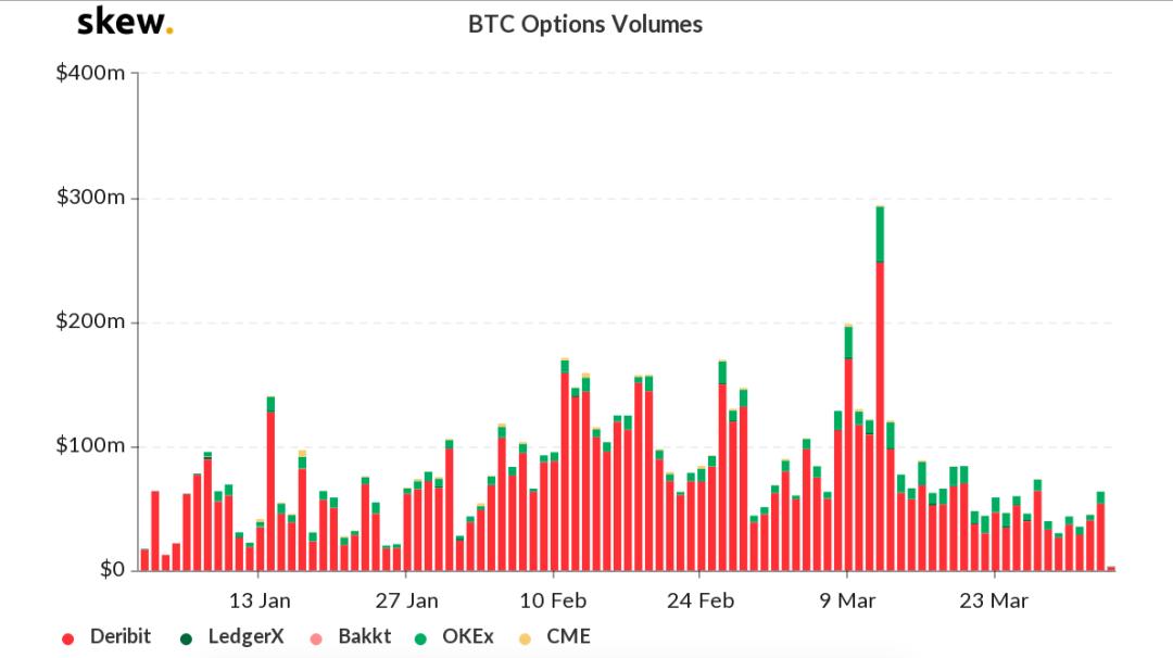 第一季度最令人关注的,莫过于期权市场。今年第一季度,OKEx、CME 相继入局期权市场,推出比特币期权交易。