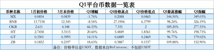 Odaily星球日报选择了六家交易所,分别为 OKEx、币安、火币、Gate、ZB、抹茶,比较各家平台币在第一季度的价格表现。
