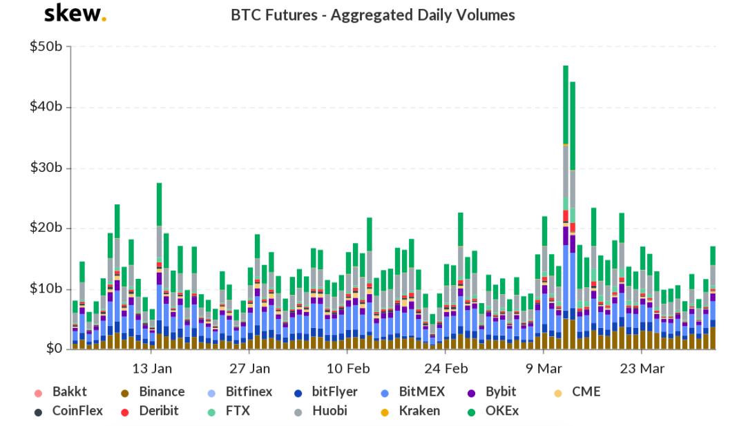 Skew 数据显示,BTC 期货日交易量从季度初的 79.93 亿美元,增长至季度末的 81.95 亿美元,涨幅 2.5%;其中,3 月 12 日期货日交易量达到最高 471.44 亿美元,3 月 13 日达到 425.1 亿美元。