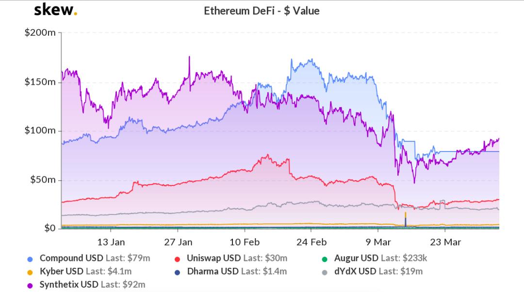 除去 MakerDAO 之外,过去一季度,也有一些 DeFi 项目表现出彩。Skew 数据显示,Synthetix 在 2 月 10 日之前锁定的 ETH 价值最高;2 月 10 日之后,Compound 开始发力,其锁定的 ETH 价值开始超过 Synthetix;季度收官时,Synthetix 以 8400 万美元略微领先 Compound(7900 万美元)。