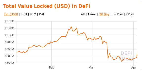 DeFiPulse 数据显示,链上锁定加密资产总价值从季度初的 6.7 亿美元,一度上涨至 12.35 亿(2 月 15 日),最大涨幅达到 84.3%;随后锁定资产价值下降,一度跌至 4.87 亿美元(3月 23 日);季度收于 5.38 亿美元,季度跌幅达到 19.7%。