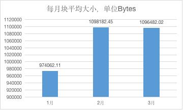 如下所示,Q1,比特币每月块平均大小呈现不断增长的态势,季度增幅 12.5%。