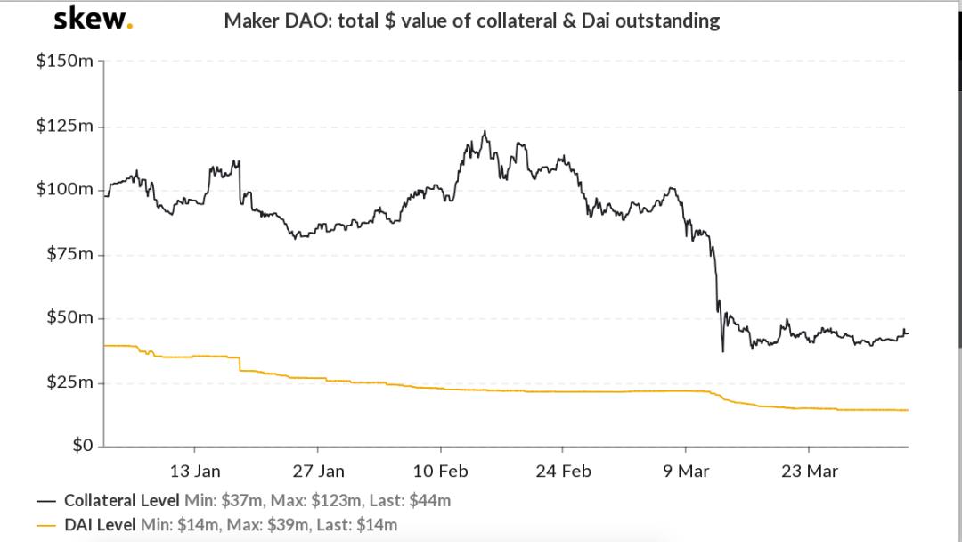 从单个项目来看,MakerDAO 上抵押品总价值一直维持在 7.5 亿美元以上,但在 3 月 12 日暴跌清算中中抵押品价值一度跌至 3.7 亿美元,季度末收于 4.2 亿美元,季度跌幅达到 60.3%。