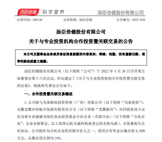 投资界-解码LP获悉,汤臣倍健发布公告,拟与为来投资、龙翼振兴共同投资设立安庆为来生命健康及绿色食品投资基金合伙企业(有限合伙),并签署相关合伙协议。公司拟作为合伙企业的有限合伙人之一,使用自有资金认缴出资6800万元,认缴出资比例为34%。