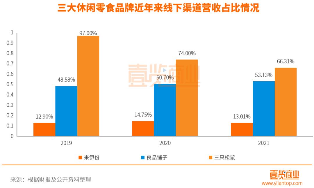与同行相比,2021年,三只松鼠线上营收占比66.31%,线下占比33.69%;良品铺子线上营收占比53.13%,线下营收占比46.87%。相比之下,来伊份在渠道发展确实存在着严重不均衡问题。