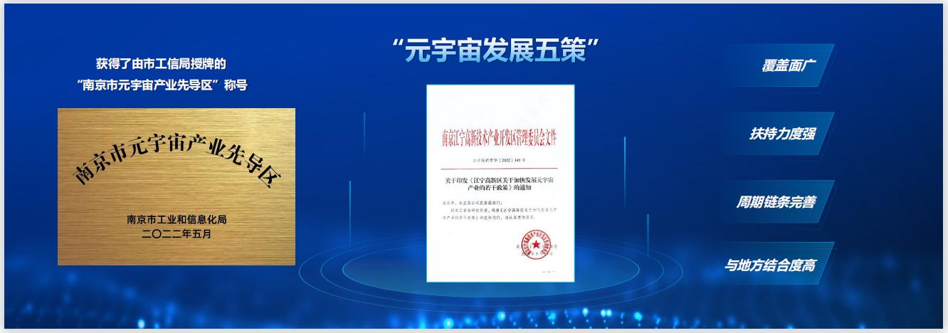 目前,南京江宁高新区已集聚一批数字经济与未来产业领域的企业,元宇宙产业初具规模;拥有丰富的科教资源和人才支撑,江宁大学城南京工程学院、金陵科技学院、南京传媒学院等8所学校开设了80多个元宇宙领域相关专业,在校师生超过2.8万名;率先出台了《江宁高新区“十四五”数字经济产业发展规划》,明确将元宇宙产业作为未来数字经济发展的重要领域;多方共建灵境元宇宙产业研究院,导入顶尖高校和机构的科研力量和前沿资源;按照“一轴两核多点”规划布局,加快建设元宇宙产业大厦,承接技术成熟性高、市场前景广的元宇宙领域优质项目和创新团队。