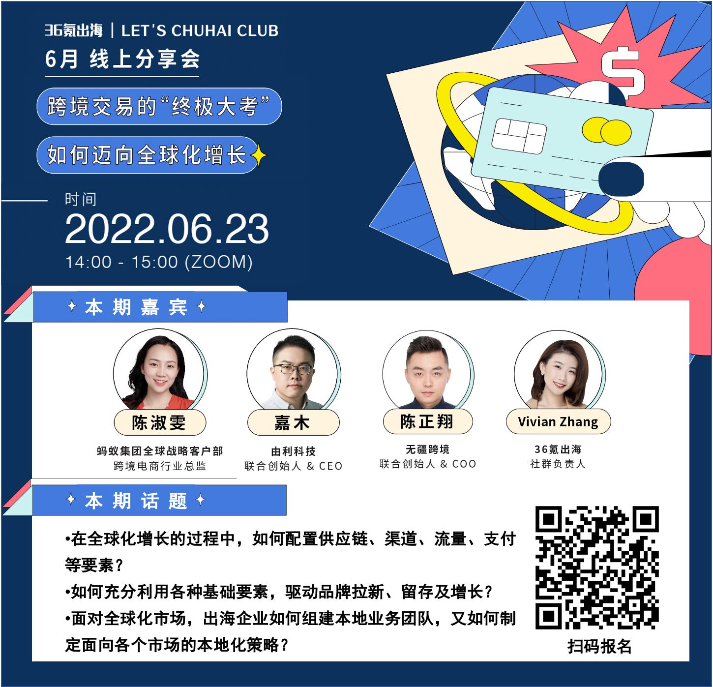 围绕跨境企业的全球化增长这一主题,36氪出海旗下 LET'S CHUHAI CLUB 社群将在6月23日(星期四)下午2:00-3:00推出线上闭门分享会活动。