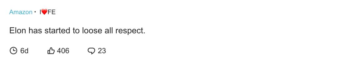 除了吃瓜网友的指责,马斯克这一轮骚操作下来,工程师们彻底坐不住了。有人称,马斯克这一系列操作,不过是想要裁掉全职员工,改而招聘成本更低、福利更少的小时工。一条获得高赞的留言表示:马斯克开始失去了人们的尊重。