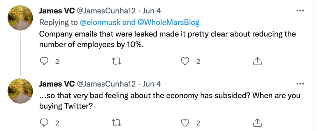 网友James VC则直接表示:泄露的公司邮件明确显示公司要裁员10%。以及如果你觉得经济下行,干嘛还要花大价钱买Twitter?(当然,James可能不知道,马斯克连买Twitter也正扬言要退出。)