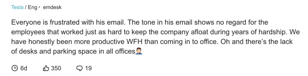 对于这样的通知,一位特斯拉内部员工表示,“每个人都对这封邮件感到沮丧。邮件的口气对于这些多年为公司打拼、帮助公司渡过难关的员工没有半点关心。老实说我们在家工作比去公司更加有效率,而且所有办公室都缺桌子也少车位的。”