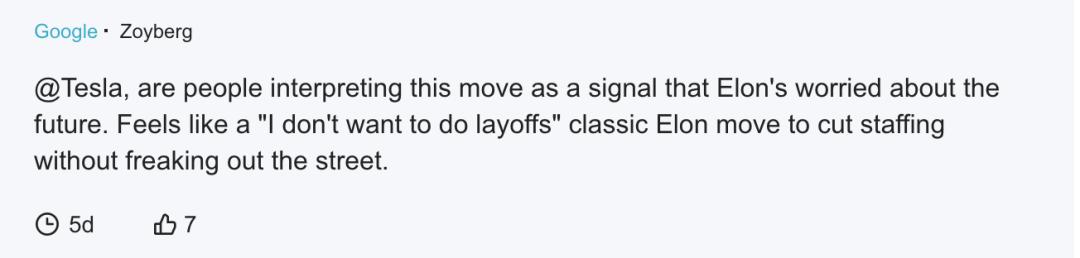一位谷歌员工在匿名职场社交App Blind上这样评价:感觉上像在说”我不想裁员“。经典马斯克风格的举动,这样来裁员而不想吓到华尔街,