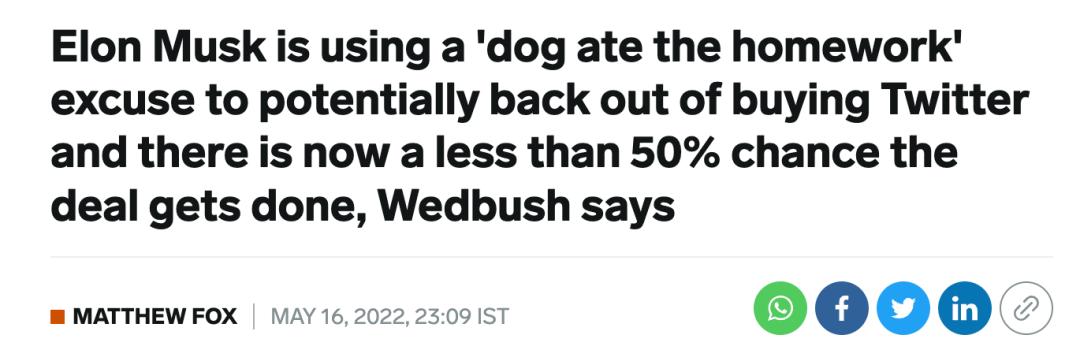 实际上,5月中旬,马斯克就已经表示担心Twitter的机器人假账户问题,此后就一直围绕着假账户问题在社交媒体各种找茬。当时Business Insider直接称:“马斯克正在用‘狗吃了我的作业本’”这样的借口来退出收购,现在交易完成的可能性只有不到50%了“。