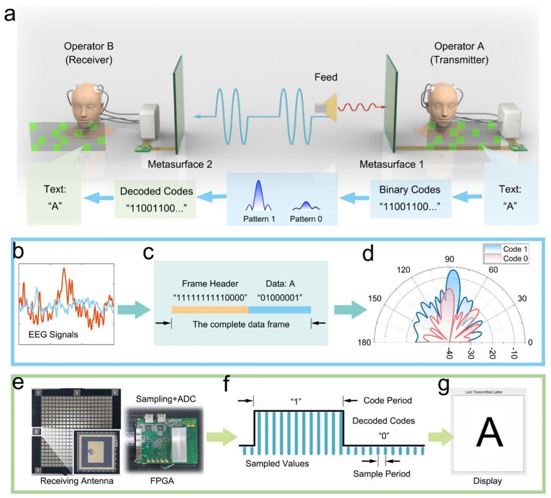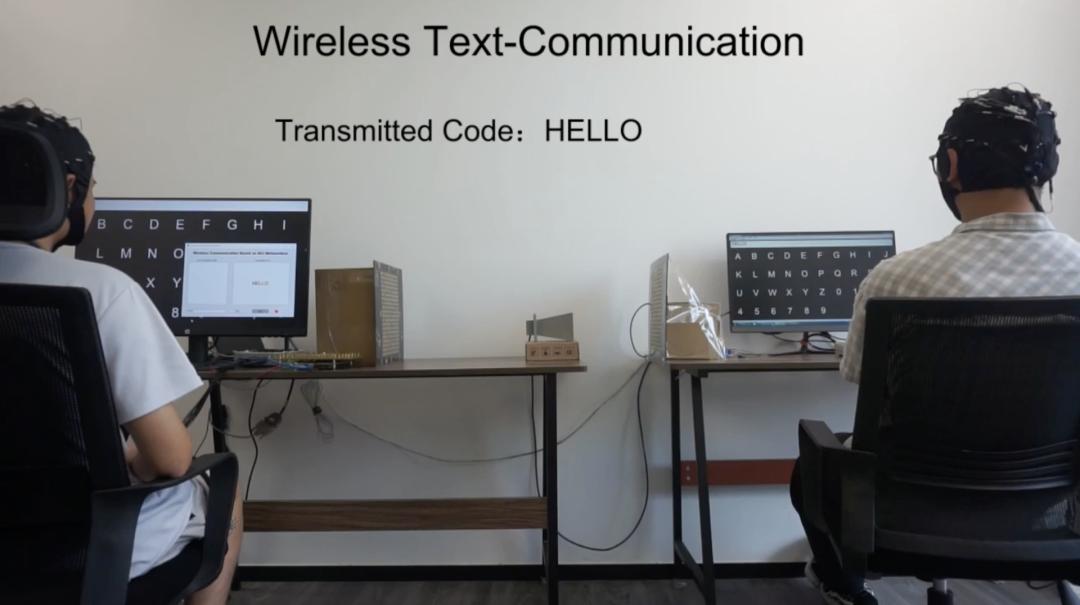 作为原型的演示,研究人员演示了文本在 EBCM 通信系统中从一个操作员到另一个操作员的无线传输。操作员 A 作为文本发送者,通过可视地查看 EBCM GUI 上的字符按钮发送字母。当从脑电图信号解码目标字母时,在 FPGA 上实现一个基于 ASCII 的编码序列,以切换时变模式,操纵超表面将信息发送到空间,由操作员 B 的 EBCM 接收、解调和呈现。