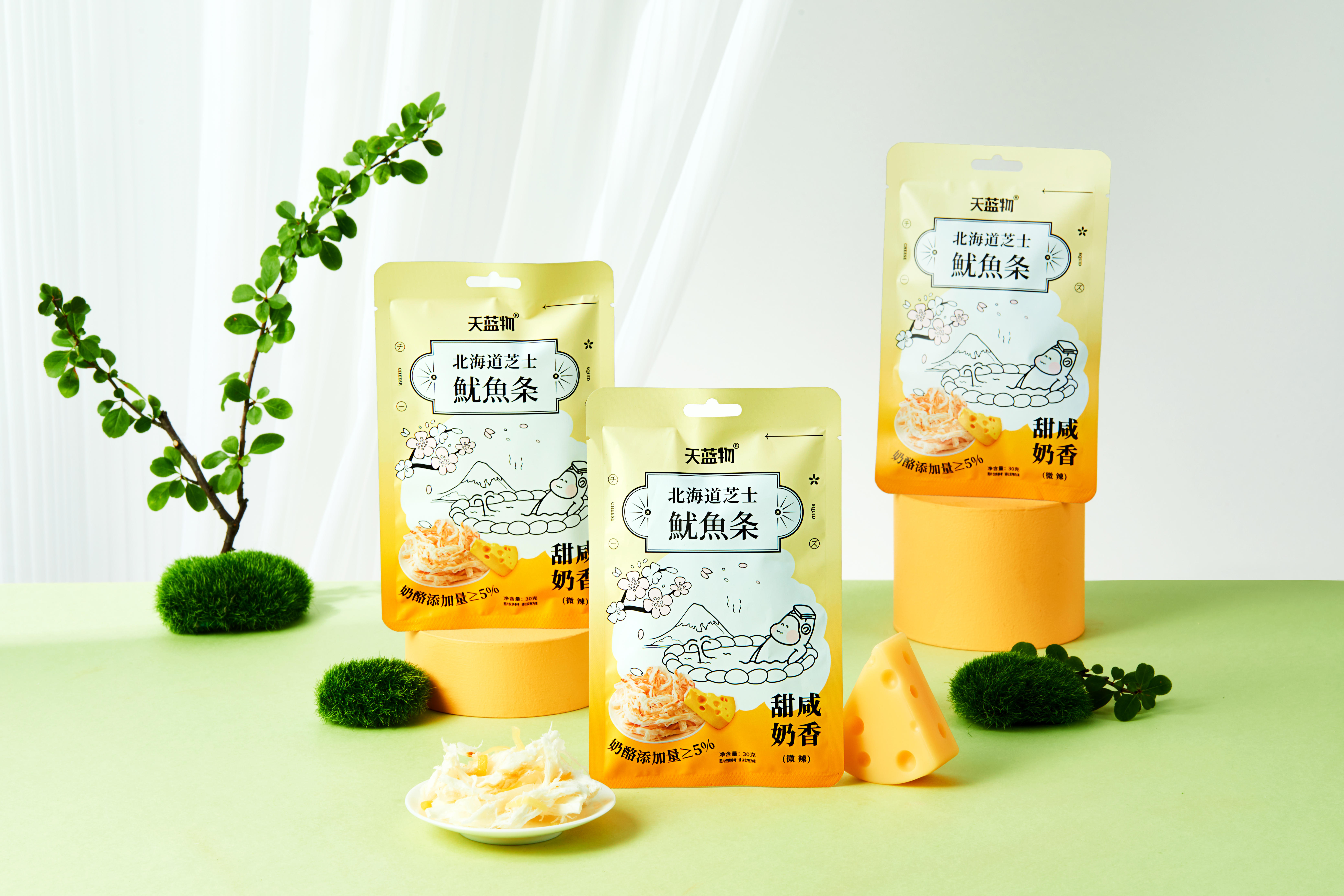 第三条线是差异化的传统海鲜零食。例如鳕鱼片,采用独立小包装的形式,配料清洁,能够保存较长时间。再如芝士鱿鱼条,深海巨鱿“腱子肉”经过黄油反复烘烤后变得软韧有嚼劲,搭配带有咸味的芝士,最后微辛调味,口感层次极为丰富。