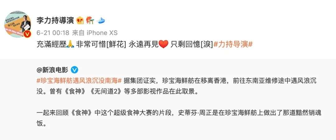珍宝海鲜舫沉没消息宣布后,《食神》导演李力持连续发了两条微博表达惋惜之情。《食神》中扮演绿毛古惑仔同时负责电影统筹的田启文曾回忆,当时为拍摄电影结局在珍宝海鲜舫一共花了7天时间,之后的电影发布会也在舫上举办,这里对他们团队来说别具意义。