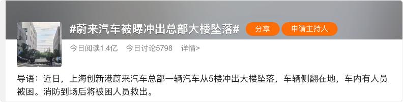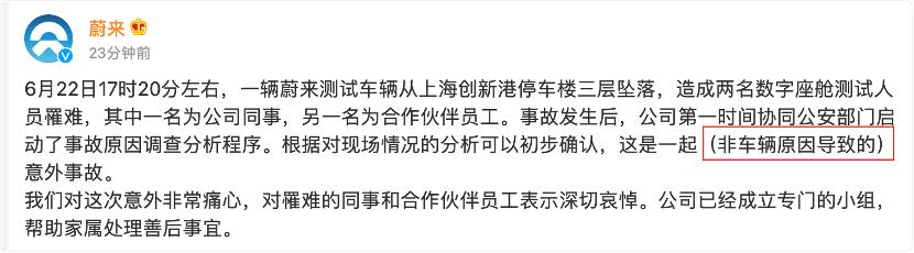 测试车辆坠楼致两人死亡,蔚来回应称“非车辆原因导致”