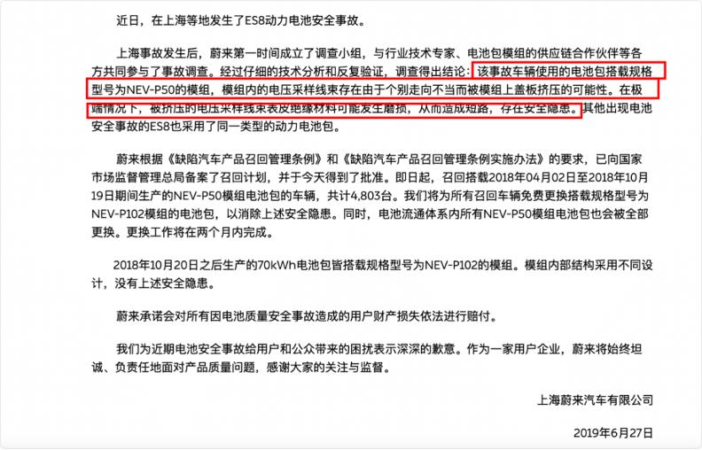但这并不是蔚来首次出现安全问题。公开信息显示,2019年蔚来旗下的ES8曾在4月、5月、6月连续发生三起自燃事故。为此,蔚来还召回了4803辆ES8,理由是电池模组存在安全隐患。