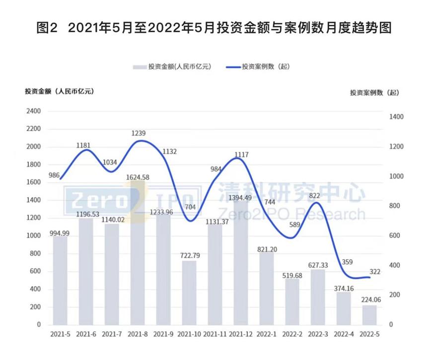 清科研究中心数据显示,2022年5月VC/PE市场共计201支基金完成新一轮募集,披露募集金额的198支基金共募集518.55亿元人民币,相比4月环比上升5.4%。投资端共发生322起投资案例,涉及投资金额224.06亿人民币。虽数量和金额相比上几个月仍在下滑,但可以明显看到下滑程度正在收缩。