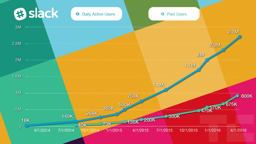 Slack 日活跃用户数(蓝色线)和付费用户数(绿色线)(2014.4.1~2016.4.1)图片来源:Techcrunch