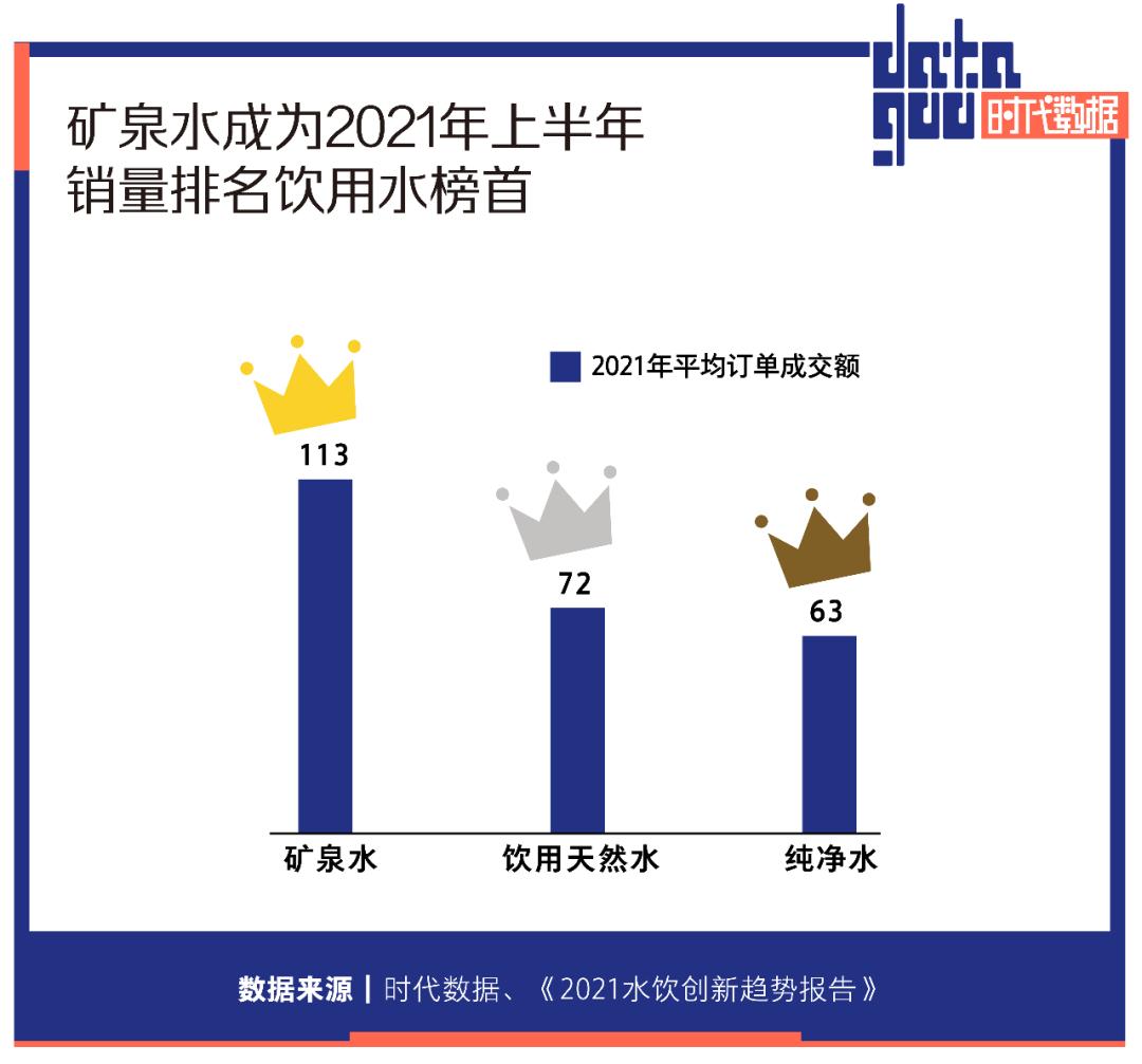公开数据显示,早在2017年,中国高端饮用水市场的增幅超过了46%;而在天猫平台,2018年,国内高端饮用水线上增长率达27%,远高于普通饮用水的5%。《2021水饮行业创新趋势报告》也指出,中高端饮用水正在被越来越多的消费者接受,在瓶装饮用水中,2021年矿泉水的平均订单成交额要显著高于其他类别。伴随着传统1元水消费增速的下滑,利润率更高的3元及以上的中高端水市场成为巨头争夺的焦点。